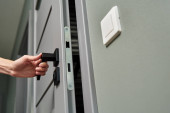 Zdjęcie "Ręcznie otwarty zamek cyfrowy z kartą magnetyczną. Koncepcja alarmu w pokoju hotelowym" może być wykorzystywane do celów osobistych i komercyjnych zgodnie z warunkami zakupionej licencji Royalty-free. Obraz jest dostępny do pobrania w jakości wysokiej rozdzielczości do 5760x3840.