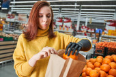Kobieta wkładająca bagietkę do kosza w supermarkecie