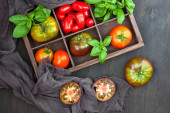 Zdjęcie "Włoska kuchnia składniki żywności. Świeże pomidory i bazylia ogrodowa. Widok z góry płaski lay" może być wykorzystywane do celów osobistych i komercyjnych zgodnie z warunkami zakupionej licencji Royalty-free. Obraz jest dostępny do pobrania w jakości wysokiej rozdzielczości do 5760x3840.