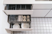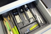 Kuchnia z nikim, czysta zastawa stołowa w szufladzie. Zestaw sztućców do domu, otwarta przechowalnia domowa z przyborami kuchennymi. Zbliżenie płaskie z metalowymi meblami domowymi, łyżką, widelcem i nożem.
