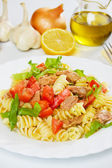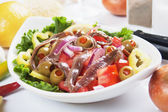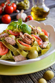 Sałatka z tuńczyka z makaronem, oliwki zielone i czarne