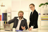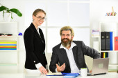 Komunikacja z kolegami. Udane interesy. Pracująca para biznesowa. Para pracuje w biurze. Konsultacja prawna. Mężczyzna i kobieta szef dyrektor. Podporządkowanie i praca zespołowa. Sprawozdanie z działalności