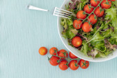 Zdjęcie "Dietetyczna sałatka na talerzu: wymieszać świeżą sałatę i pomidory. Widok z góry, przestrzeń kopiowania" może być wykorzystywane do celów osobistych i komercyjnych zgodnie z warunkami zakupionej licencji Royalty-free. Obraz jest dostępny do pobrania w jakości wysokiej rozdzielczości do 5760x3840.