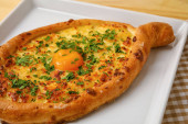 Pergamin ze smacznym Ajariańskim khachapuri na jasnym tle, zbliżenie