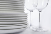 Stacked czyste naczynia i szklanki na białej półce w pomieszczeniach