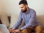 Mężczyzna siedzący przy laptopie i płacący kartą kredytową online