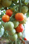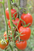W ogrodzie, pomidory wiśniowe rosną na otwartym terenie