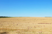 Pola po zbiorach pod błękitnym niebem w słoneczny sierpniowy dzień