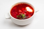 Wlać zupę pomidorową z klopsikami i ziołami do talerza