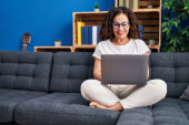 Szczęśliwa młoda kobieta pracuje na laptopie siedząc na kanapie