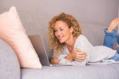 Zdjęcie "Szczęśliwa młoda kobieta pracuje na laptopie siedząc na kanapie" może być wykorzystywane do celów osobistych i komercyjnych zgodnie z warunkami zakupionej licencji Royalty-free. Obraz jest dostępny do pobrania w jakości wysokiej rozdzielczości do 5760x3840.