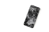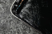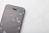 Uszkodzony smartfon na niebieskim drewnianym stole, widok z góry z miejscem na tekst. Naprawa urządzenia
