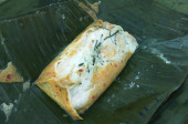 Zdjęcie "Arrowroot Ottada to zdrowa zdrowa przekąska. Wykonane z mielonej maranta miesza się z kokosem. Gotowane na tawie, jak appam zawinięty w liść banana. Popularny w regionie Malabar Kerala." może być wykorzystywane do celów osobistych i komercyjnych zgodnie z warunkami zakupionej licencji Royalty-free. Obraz jest dostępny do pobrania w jakości wysokiej rozdzielczości do 5760x3840.