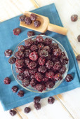 Miska ze smaczną suszoną żurawiną na stole, zbliżenie