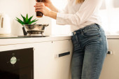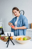 Uśmiechnięty bloger z nadwagą przy użyciu smartfona w pobliżu blendera i owoców w kuchni