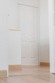 Zamknij ujęcie z białymi drzwiami z wentylacją w nowoczesnym domu z winylowymi deskami na podłodze.