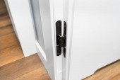 Zamknij ujęcie z białymi drzwiami z wentylacją w nowoczesnym domu z winylowymi deskami na podłodze.