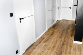 Białe drzwi z podcięciem wentylacyjnym z matową czarną rączką i czarną linią pośrodku w nowoczesnym domu z panelami winylowymi na podłodze.