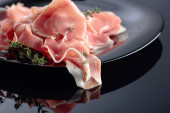 Prosciutto i świeża sałata na czarnym tle odblaskowym.