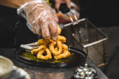 szef kuchni przygotowuje smażone krążki cebulowe w kuchni restauracji.