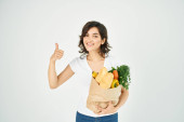 kobieta z opakowaniem artykułów spożywczych zdrowe zakupy żywności