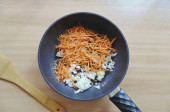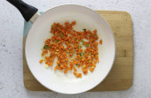 Pokroić cebulę i marchewkę na małe kostki. Podgrzać patelnię z olejem roślinnym, smażyć warzywa do złotego brązu.