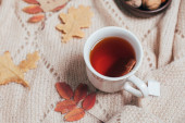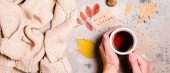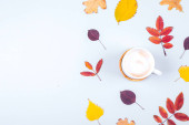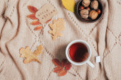 Jesienne płaskie leżały z filiżanką herbaty, kolorowe jesienne liście, orzechy na betonowym tle. Widok z góry
