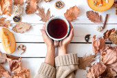 Zdjęcie "Jesienne płaskie leżały z filiżanką herbaty, kolorowe jesienne liście, orzechy na betonowym tle. Widok z góry" może być wykorzystywane do celów osobistych i komercyjnych zgodnie z warunkami zakupionej licencji Royalty-free. Obraz jest dostępny do pobrania w jakości wysokiej rozdzielczości do 5760x3840.