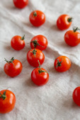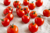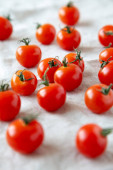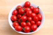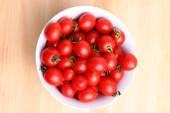 Zdjęcie "Świeże czerwone organiczne pomidory wiśniowe w misce, widok z góry. Płaskie ułożenie, nad głową, z góry. " może być wykorzystywane do celów osobistych i komercyjnych zgodnie z warunkami zakupionej licencji Royalty-free. Obraz jest dostępny do pobrania w jakości wysokiej rozdzielczości do 5760x3840.