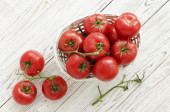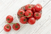 Świeże czerwone organiczne pomidory wiśniowe w misce, widok z góry. Płaskie ułożenie, nad głową, z góry.