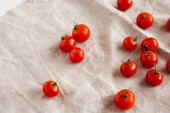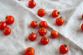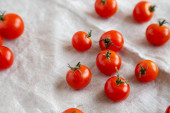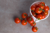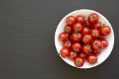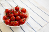 Zdjęcie "Świeże czerwone organiczne pomidory wiśniowe w misce na białym drewnianym tle, widok z góry. Leżał płasko, nad głową, z góry. Przestrzeń kopiowania." może być wykorzystywane do celów osobistych i komercyjnych zgodnie z warunkami zakupionej licencji Royalty-free. Obraz jest dostępny do pobrania w jakości wysokiej rozdzielczości do 5760x3840.
