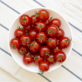 Świeże czerwone organiczne pomidory wiśniowe w misce na białym drewnianym tle, widok z góry. Leżał płasko, nad głową, z góry. Przestrzeń kopiowania.