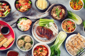 Zdjęcie "Azjatyckie potrawy i przekąski na drewnianym tle. Tradycyjna koncepcja żywności. Płaskie ułożenie, widok z góry" może być wykorzystywane do celów osobistych i komercyjnych zgodnie z warunkami zakupionej licencji Royalty-free. Obraz jest dostępny do pobrania w jakości wysokiej rozdzielczości do 5760x3840.