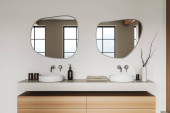 Zdjęcie "Beżowa ściana łazienki ze stylowym okrągłym lustrem nad próżnością. Elegancki design z koncepcją nowoczesnego na modne wnętrze. 3d renderowanie" może być wykorzystywane do celów osobistych i komercyjnych zgodnie z warunkami zakupionej licencji Royalty-free. Obraz jest dostępny do pobrania w jakości wysokiej rozdzielczości do 5760x3840.