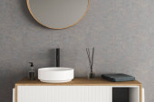 Beżowa ściana łazienki ze stylowym okrągłym lustrem nad próżnością. Elegancki design z koncepcją nowoczesnego na modne wnętrze. 3d renderowanie