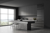 Zdjęcie "Narożnik panoramicznego szarego wnętrza kuchni z barem śniadaniowym, trzema lampami wiszącymi, dwoma stolcami, stylowymi szafkami i ciemnym drewnem. Betonowa podłoga. Koncepcja projektowania trendów. 3d renderowanie" może być wykorzystywane do celów osobistych i komercyjnych zgodnie z warunkami zakupionej licencji Royalty-free. Obraz jest dostępny do pobrania w jakości wysokiej rozdzielczości do 5760x3840.