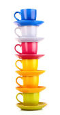 Kolorowy kubek kawy na kolorowym tle papieru Wiele filiżanek do kawy i herbaty w kawiarni Koncepcja tła żywności i napojów