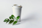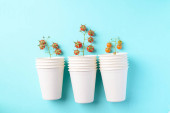 Ekologia. Stos papierowych kubków z zielonymi liśćmi na delikatnym tle.Koncepcja zerowej ilości odpadów, zastąpienie plastiku artykułami papierniczymi i innymi szybko rozkładającymi się materiałami.Zdjęcie pionowe