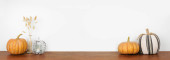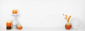 Jesienny wystrój na drewnianej półce na białym tle ściany. Baner z przestrzenią do kopiowania. Świece, wazony i żywe gałęzie.