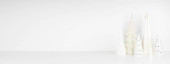 Wystrój jesienny na białej półce na białym tle ściany. Baner z przestrzenią do kopiowania. Świece, wazony i żywe gałęzie.