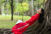 kobiety Azji dziewczyna siedzi relaks w sosnowym lesie natura lato wakacje koncepcja