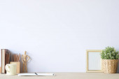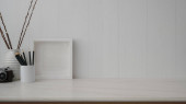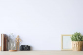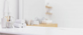 Miejsce na makietę do montażu na drewnianym blatze z minimalistycznymi akcesoriami kąpielowymi nad skandynawskim wnętrzem łazienki w tle. 3d renderowanie, ilustracja 3D