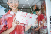 kobieta w czerwonym t-shircie przygotowuje się do otwarcia sklepu poprzez umieszczenie otwartego znaku na drzwiach przedniej szyby