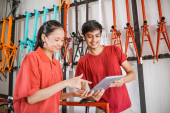pracownik obsługujący klienta korzystającego z tabletu cyfrowego podczas zakupów w sklepie rowerowym