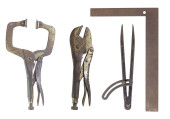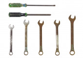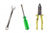 Stare narzędzia odizolowane na białym tle. Stary zestaw narzędzi.