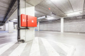W środku dużego miasta pod dużym budynkiem jest ten nowy, dwupiętrowy podziemny garaż.