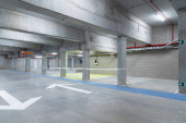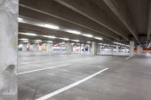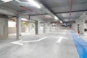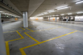 W środku dużego miasta pod dużym budynkiem jest ten nowy, dwupiętrowy podziemny garaż.