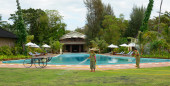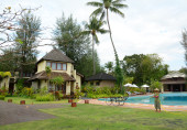 Lombok, Indonezja - 17 kwietnia 2016. Hotel nad morzem na wyspie Lombok, Indonezja. Lombok przyciąga turystów swoją dziewiczą przyrodą, pięknymi plażami.