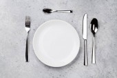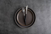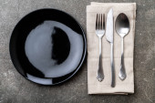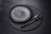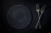 Sztućce i naczynia na ciemnym teksturowanym tle. Nakrycie stołu