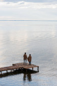 Zdjęcie "Widok z tyłu pary trzymającej się za ręce w pobliżu morza, sztandar " może być wykorzystywane do celów osobistych i komercyjnych zgodnie z warunkami zakupionej licencji Royalty-free. Obraz jest dostępny do pobrania w jakości wysokiej rozdzielczości do 5760x3840.